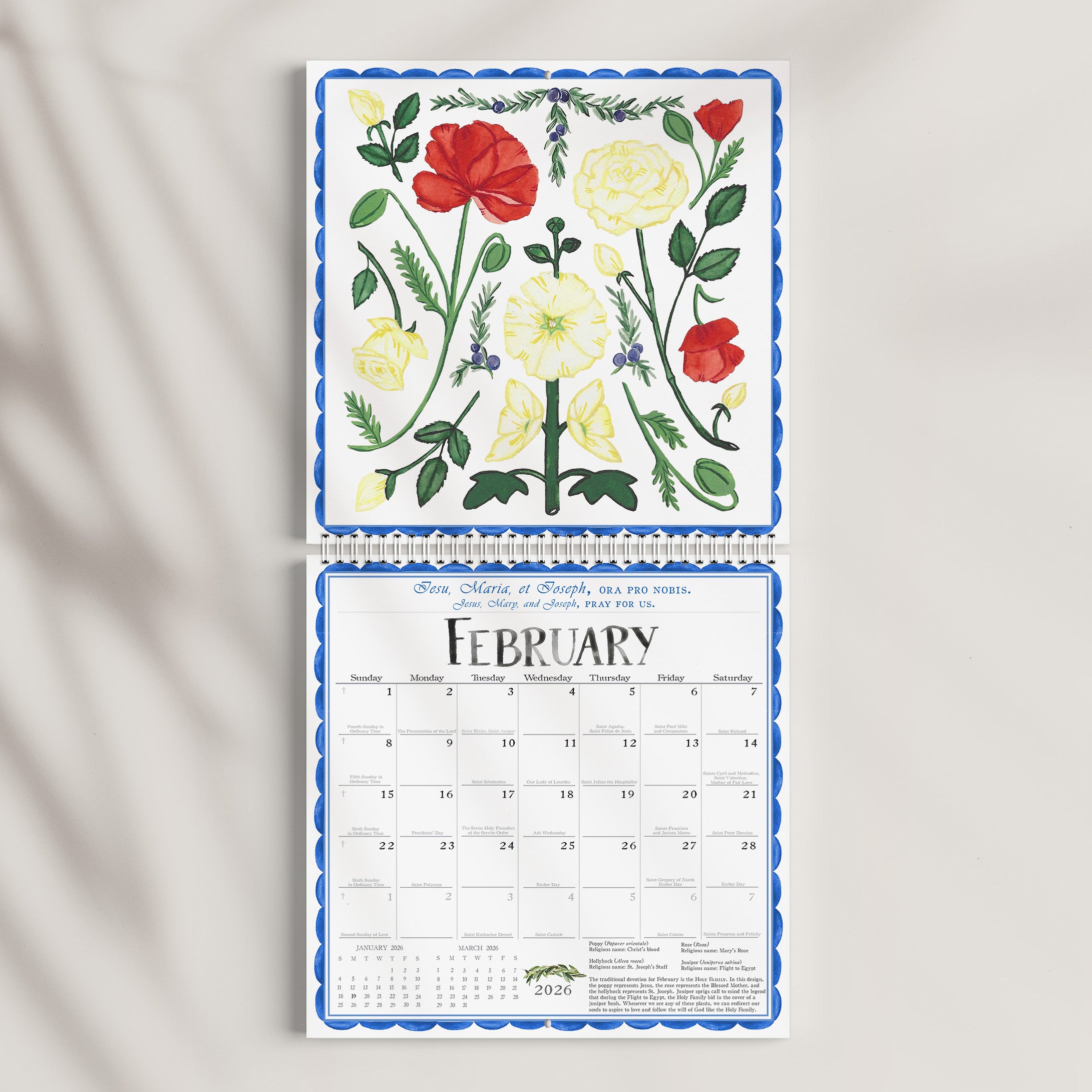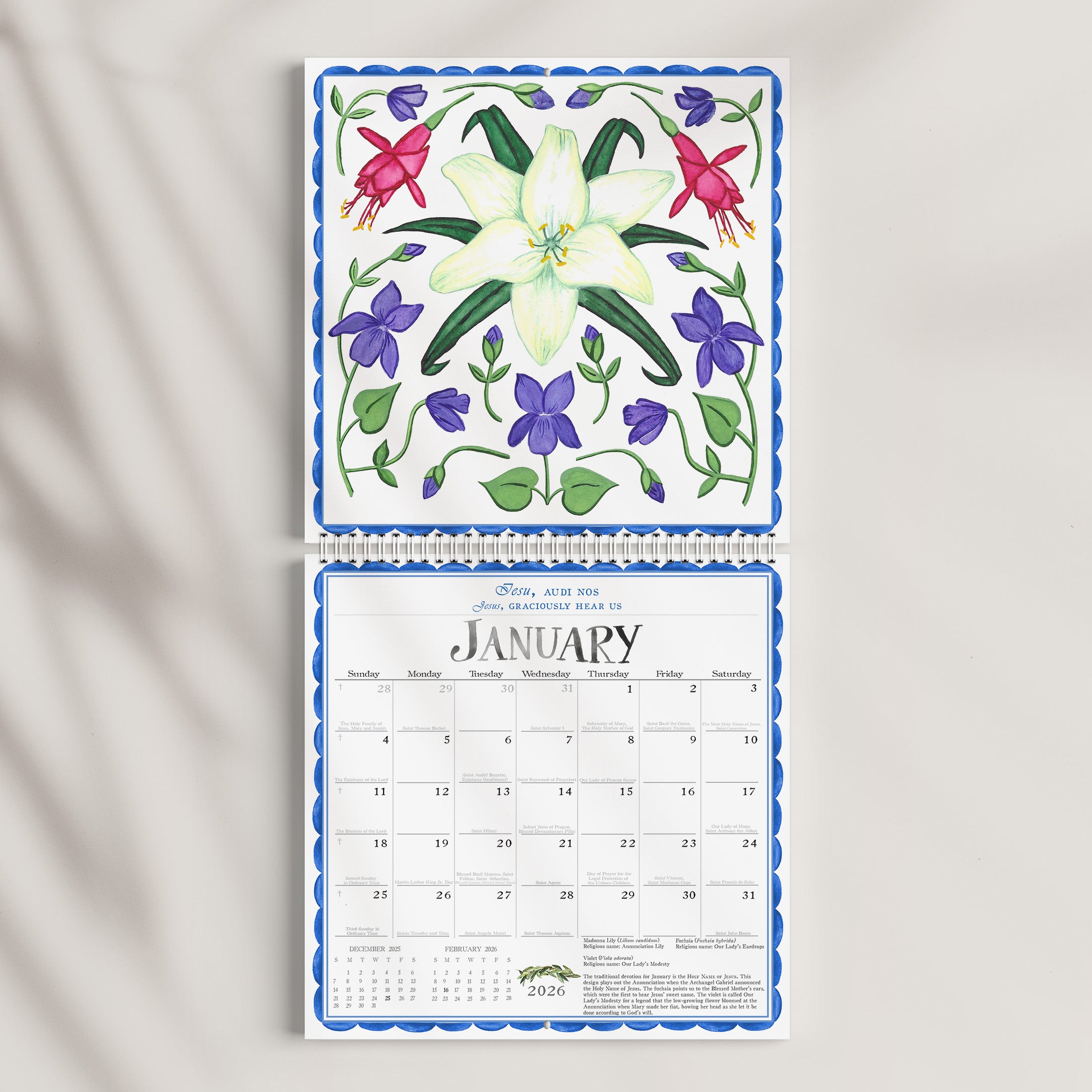 A calendar that will add both watercolor florals and the Catholic devotions of each month via paintings and design from Katrina Harrington.