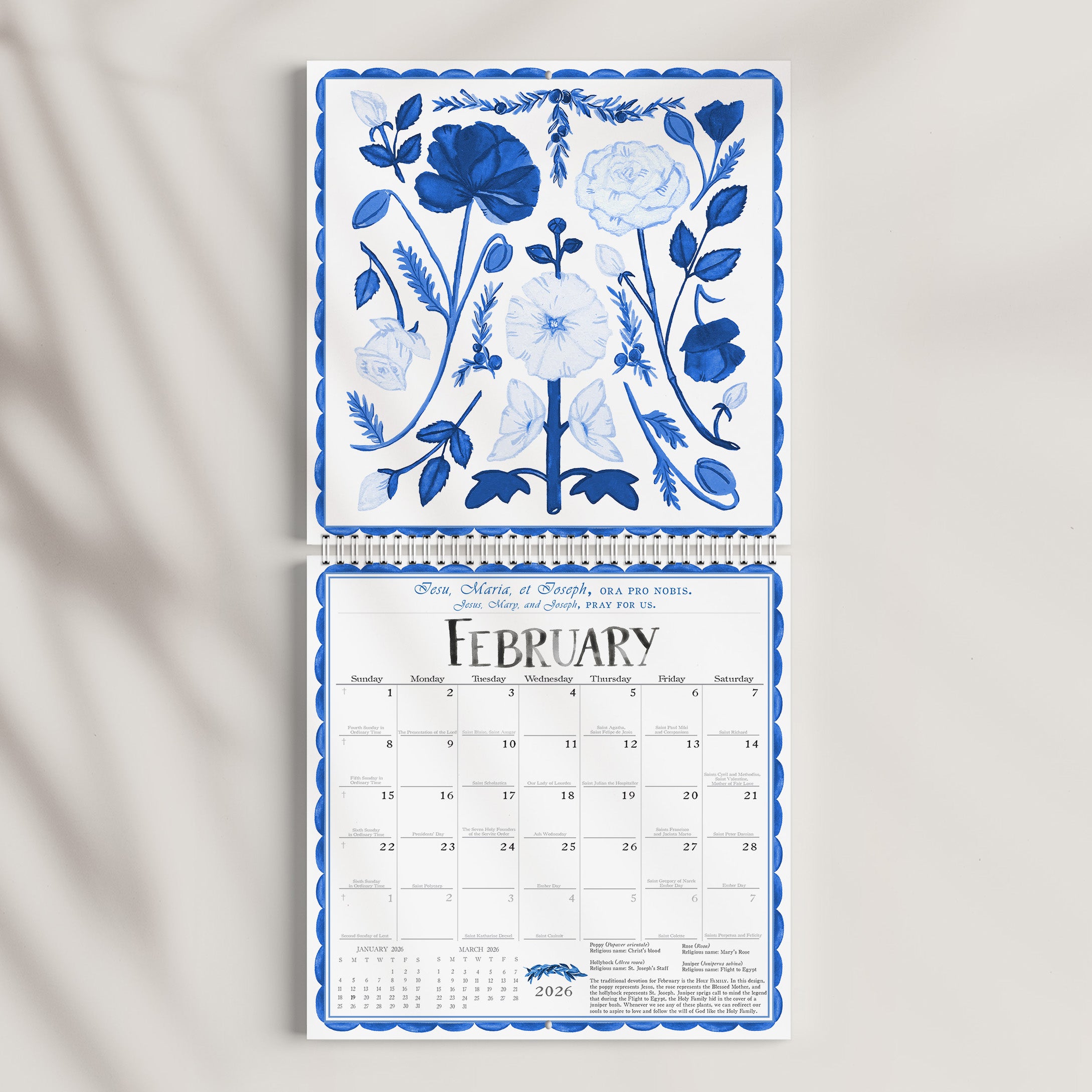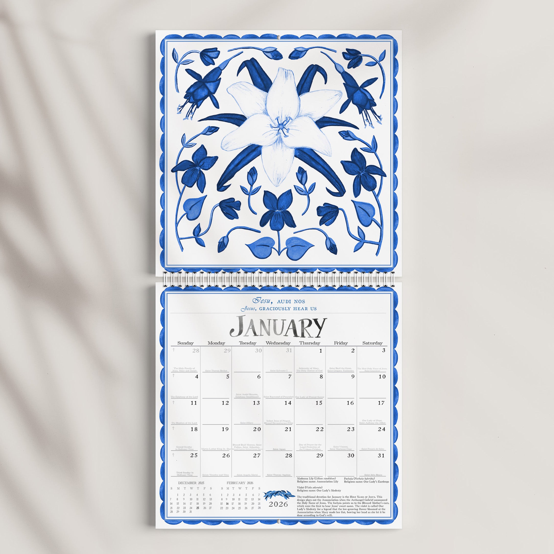 In Her wisdom, the Church dedicates each month to a different devotion so we can grow closer to the Lord. The surface pattern designs in the calendar art include beautiful flowers compiled to represent each devotion. On the first page of the calendar, you will find the complete list of flowers used. This floral wall calendar follows the liturgical calendar for the Dioceses of the USA and includes feast days of saints from all around the world.